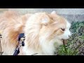 In the middle of a walk, fluffy cat's PRIN eats grass.